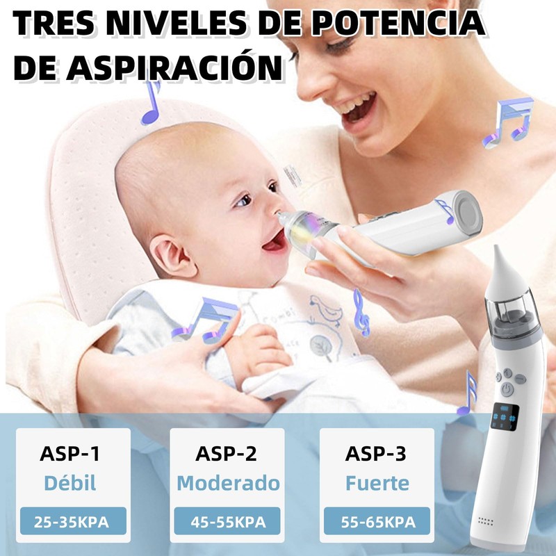 - Experiencia de Música Calmante: Para ayudar a que su bebé se sienta tranquilo durante el proceso de limpieza, el extractor de mocos para bebe tiene una función de música. La música relajante está diseñada para calmar al bebé, reducir el estrés asociado con la eliminación de la mucosidad y promover una experiencia más agradable. Ayuda a distraer a su bebé y crear un ambiente tranquilo