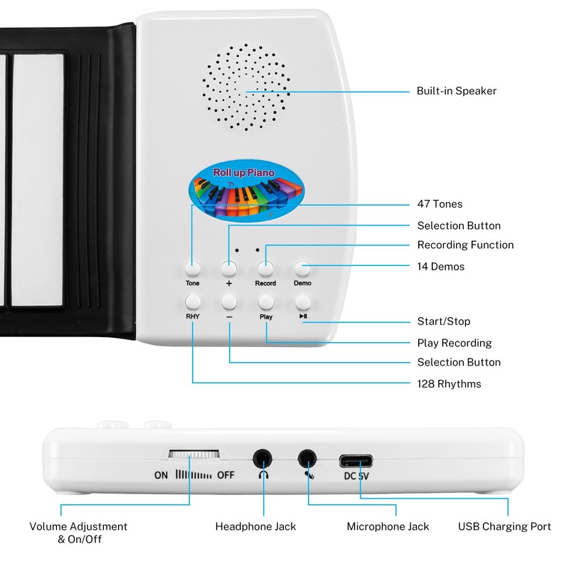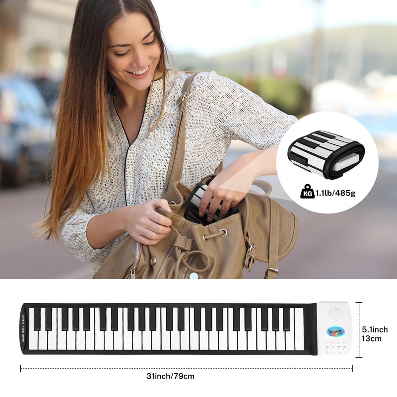 - ROLL UP DESIGN & PORTABLE & RECHARGEABLE --- The soft piano mat is portable and flexible. Easily unfold when playing, roll it back into the box or backpack after playing, it saves space and is easy to store. Easy to carry, you can take it anywhere and start playing with friends/family. Built-in rechargeable battery, you can charge it anytime.