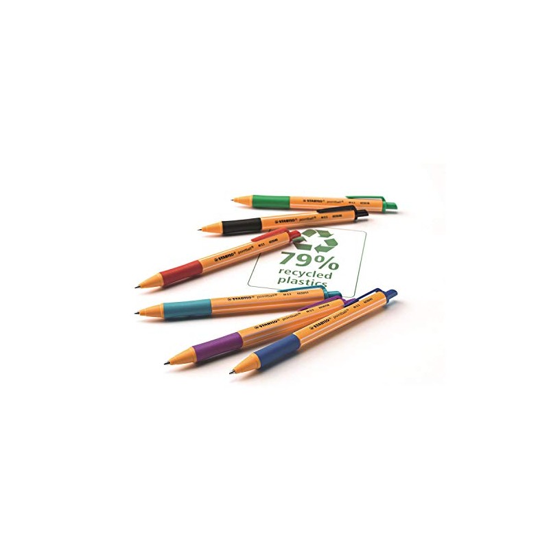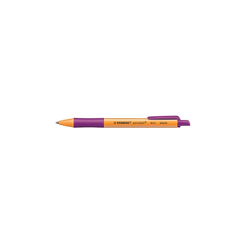 Stabilo Pointball Ballpoint Pen. Push-button mechanism. Cartridge Type: Standard large-capacity refill Ballpoint Pen. Cartridge Type: 0.5 mm, purple, replaceable. Pen Design: Plastic (PP), easy to hold. Clip design: Plastic Clip, in the same colour as the ink. Made of 79% recycled plastic.With extremely soft Ballpoint Pen paste for writing quickly. Refillable with STABILO ballpoint refill. Barrel colour: Combination of orange with white side stripes and the writing colour.