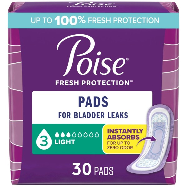 - POISE INCONTINENCE PADS: 30 incontinence and postpartum bladder leak pads, 3 Drop Light Absorbency, regular length (30 pads total)