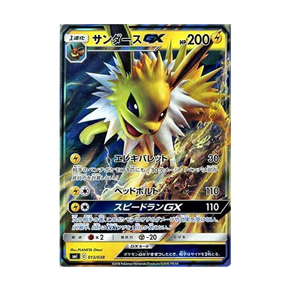 - ★ Includes: Pokemon Card Game Sun & Moon Starter Set "Fire Booster GX, Water Shower GX, Thunder Thunders GX" ■Card Name: Sanders GX ■HP: 210/Type: Lightning ■Classification: 1 Evolution (Eeve) ■ Waza: Electric Valet/Damage: 30 damage to 1 bench Pokemon. [Benches do not calculate weakness and resistance] ● Thunder: Head Bolts / Damage: 110 ● Thunder: Speedrun GX/Damage: 110 The next opponent's number this Pokémon will not be damaged or effective. ■Weakness: Fighting x 2/Resistance: Steel - 20/Retreat 0 (013/038) *First edition and reissues are all in the same stock, so you cannot choose it. Thank you for your understanding
