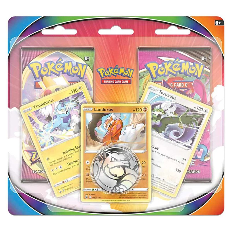 Expand your collection with three foil Pokémon trading card playing cards featuring Tornadus, Thundurus and Landorusplus a metallic coin, two Pokémon TCG booster packs and a code card for Pokémon TCG Live!