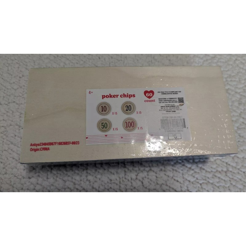 New sealed 60 poker chips. There are fifteen of 10, 20, 50, and 100.