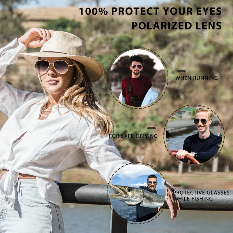 - HD POLARIZED LENS AND UV400 :Polarized sun glasses reduce glare reflected off of roads, bodies of water, snow, and other horizontal surfaces. Restore true color, eliminate reflected light and scattered light and protect eyes perfectly.The mens womens Sunglasses vision lenses are 400UV rated, meaning it can block 99%-100% of both UVA and UVB radiation. UV404 rated eyewears are essential to protecting your eyes against long.
