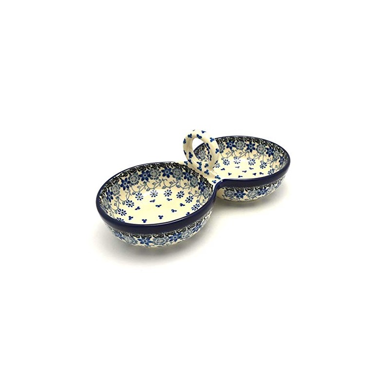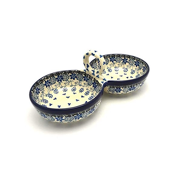 4H x 4 3/4W x 9 3/4L Handmade and hand-painted in Poland This double serving bowl is complimented with a loop handle and can be used to serve nuts, candies, and condiments! All of our Polish Pottery is safe for use in the microwave, dishwasher, and oven 942- , Divided Dishes , Serving , 2158a , Silver Lace , Traditional , double serving bowl , bowl with handle , condiment bowl , candy dish , polish pottery , ca pottery , ceramika artystyczna , polish stoneware
