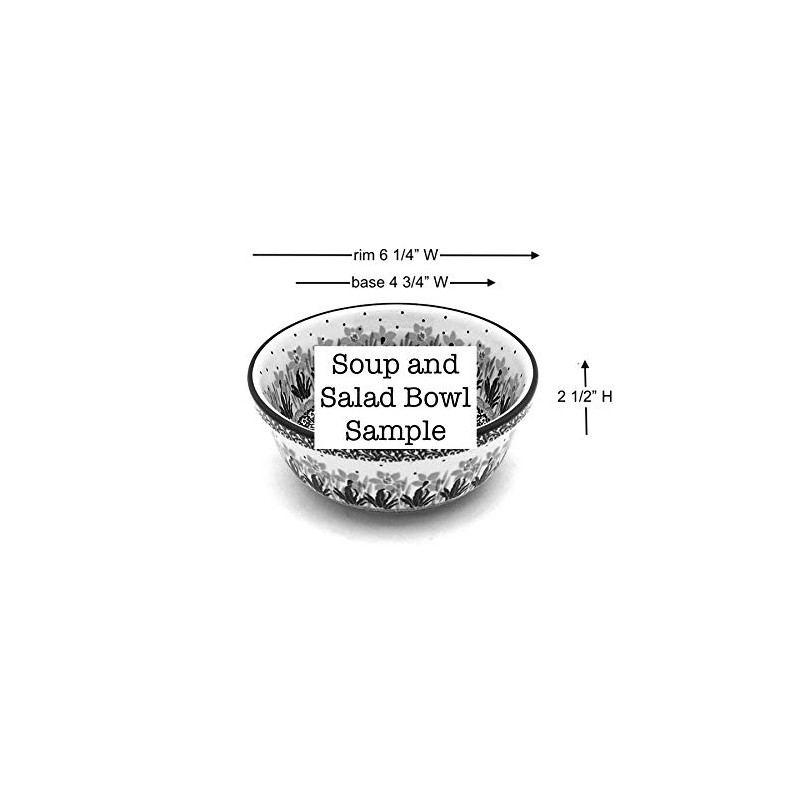 2 1/2H x 6 1/4W Handmade and hand-painted in Poland. Perfect for soup, salad, cereal and more. All of our Polish Pottery is safe for use in the microwave, dishwasher, and oven.