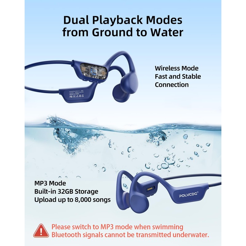 - Wireless & MP3 Dual Modes: Our wireless bone conduction headset offers both Wireless Mode and MP3 Mode. With 32GB of built-in storage, you can store over 8,000 songs for phone-free listening, allowing you to enjoy music without needing your phone. Whether you're running, cycling, or simply relaxing, you can easily switch between modes for a seamless listening experience.