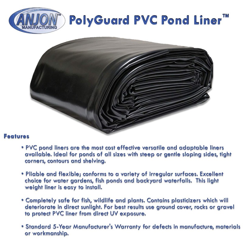 PolyGuard 20-Mil PVC Pond Liners are the most cost effective versatile and adaptable liners available. Ideal for ponds of all sizes with steep or gentle sloping sides, tight corners, contours and shelving. Pliable and flexible; conforms to a variety of irregular surfaces. Excellent choice for water gardens, fish ponds and backyard waterfalls. PolyGuard PVC Pond Liner is light weight and easy to install