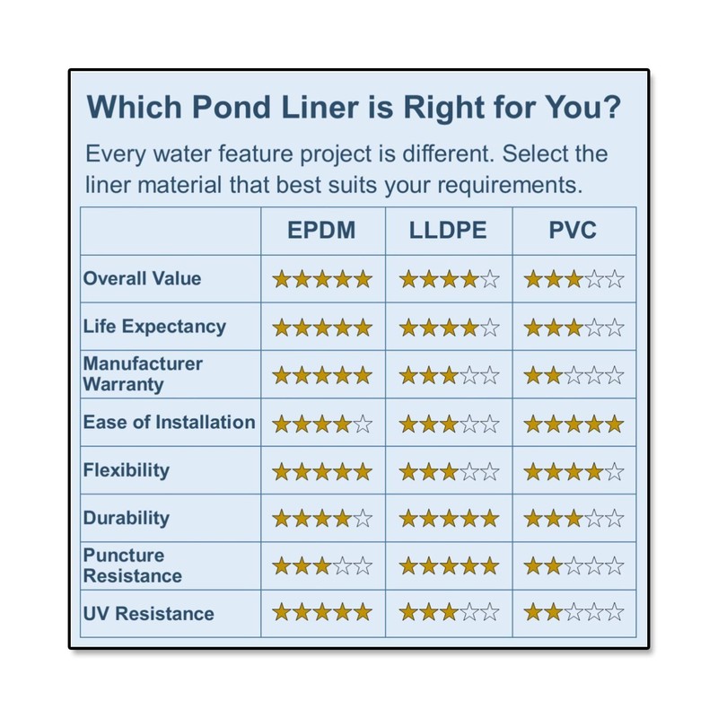 - Pliable and flexible; conforms to a variety of irregular surfaces. Excellent choice for water gardens, fish ponds and backyard waterfalls. This light weight liner is easy to install.