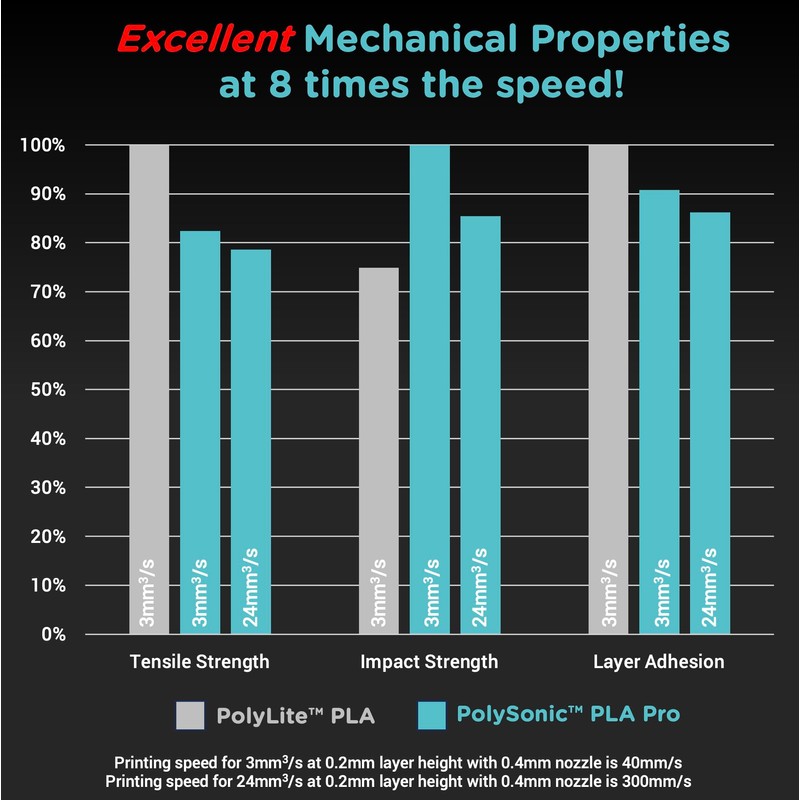 - 【Mechanical Properties】- PolySonic PLA Pro retains 90% of the mechanical properties printed when printed at 300mm/s compared with 46.5mm/s. It outperforms better toughness compared to PolySonic PLA and even most tough materials like ABS and ASA