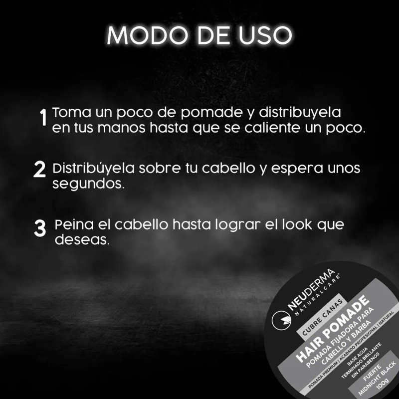 Transforma tu peinado y luce un aspecto más joven con nuestra Pomada Base Agua para Cubrir Canas. Pruébala hoy mismo y disfruta de la confianza que aporta un cabello impecable y libre de canas, acompañado del elegante aroma a Midnight Black.