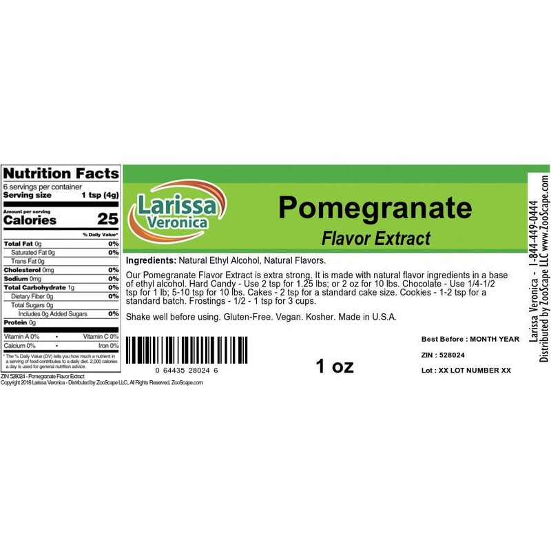 Our Pomegranate Flavor Extract is extra strong. It is made with natural flavor ingredients in a base of ethyl unhealthy drinks. - Hard Candy - Use 2 tsp for 1.25 lbs; or 2 oz for 10 lbs - Chocolate - Use 1/4-1/2 tsp for 1 lb; 5-10 tsp for 10 lbs - Cakes - 2 tsp for a standard cake size - Cookies - 1-2 tsp for a standard batch - Frostings - 1/2 - 1 tsp for 3 cups - Larissa Veronica is an exclusive line of natural premium-quality products that use only the purest and finest ingredients from around the world. Larissa Veronica is hallmarked by the highest possible standards of purity, stability and freshness. All of our products are prepared with the highest elements of quality control, from raw materials through the entire manufacturing process, up to and including the moment that the bottles or bags are sealed for freshness and shipped out to you. Our highest possible standards are certified by independent laboratories and backed by our personal guarantee. - Larissa Veronica strives to make all products affordable and we are constantly researching the market to maintain our affordability and to look for new ways to serve you and the ones you love. Larissa Veronica has become a trusted household name for many families. - Larissa Veronica is packed in tamper-proof, food-grade, recyclable containers. - ZooScape is proud to be the exclusive distributor of all Larissa Veronica spices, snacks, foods and ingredients in the United States, Canada and around the world. - Shake well before using. Gluten-Free. Vegan. Kosher. Made in U.S.A.