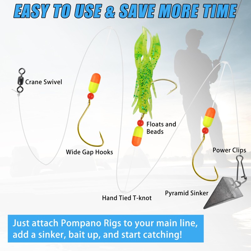 - 【Save more time】Pre Rigged Pompano Rigs are ready to use any time you need them without the time and trouble of tying up your own. The Pompano Rig is available in 12 or 6 packs, giving you the peace of mind that you will have all the rigs you need for a full day of fishing no matter the conditions.