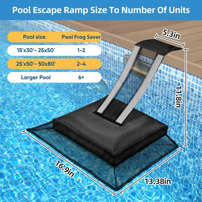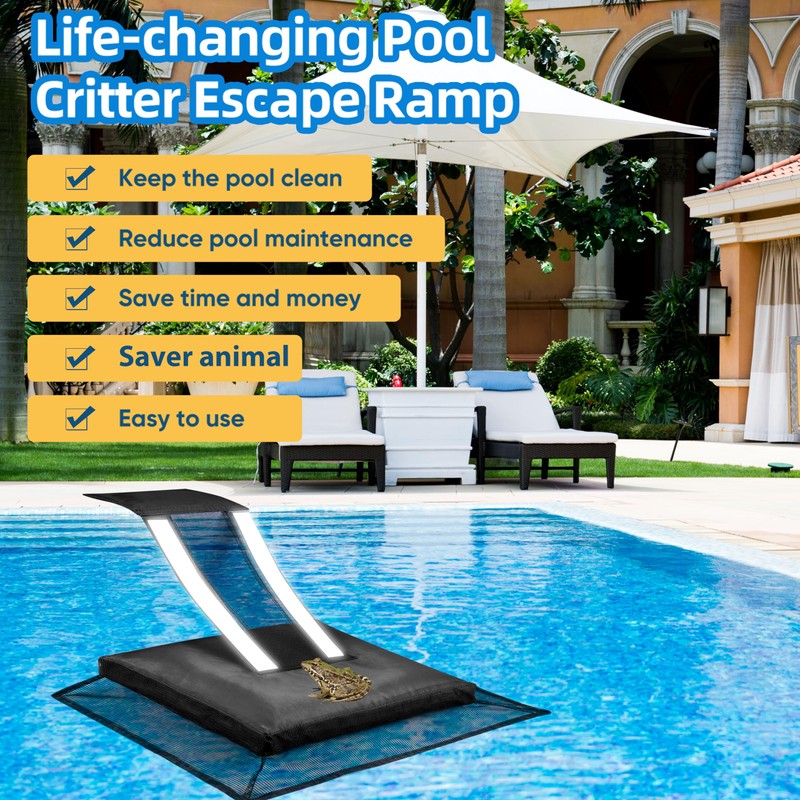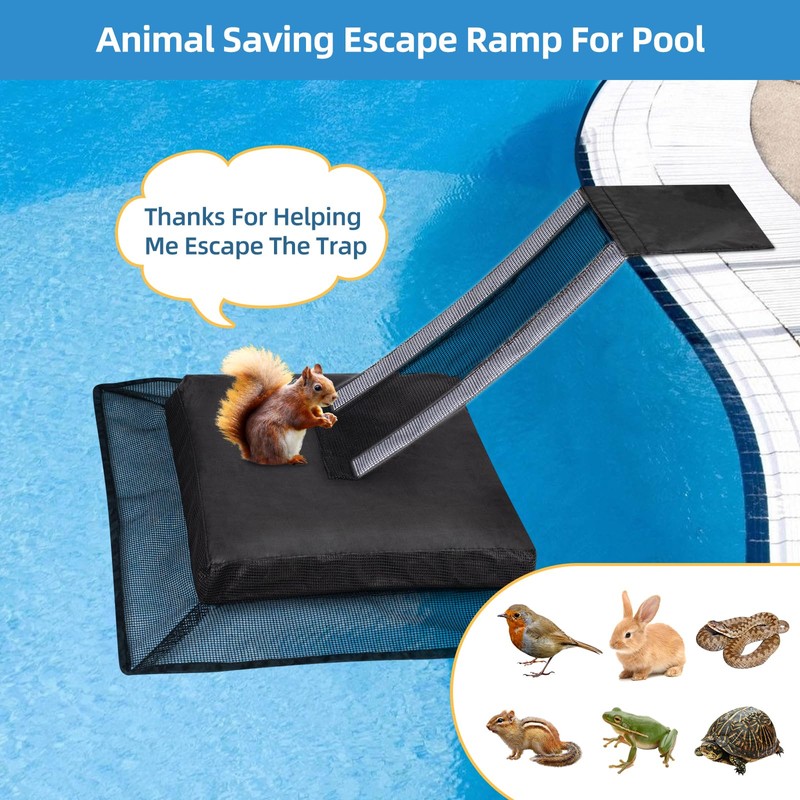 • 🐸Keeps Pool Water Cleaner, Reduces Maintenance: frog saver for swimming pool not only provides a lifeline for small animals but allows them to swiftly and safely exit your pool, preventing death by drowning By preventing animals from becoming trapped and potentially contaminating the water, pool critter escape ramp significantly reduce the frequency of pool cleanings. Enjoy more time relaxing by the pool and less time cleaning it, all while you're creating a safer environment for animals.