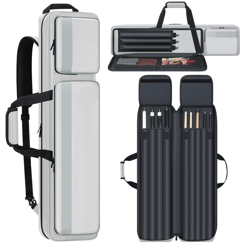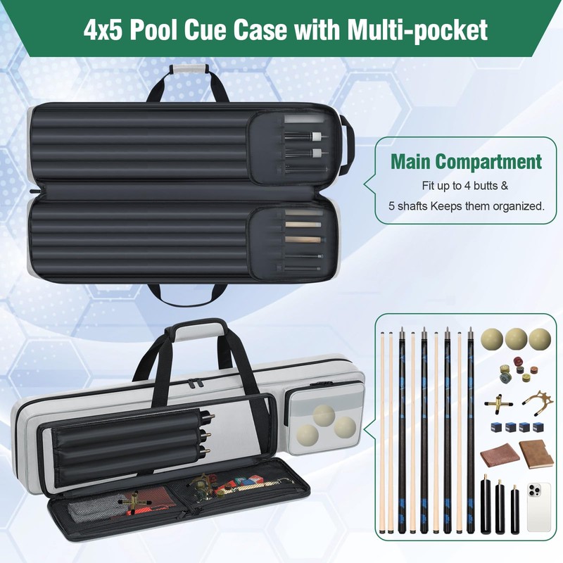 Billiard Stick Bag - Soft Padded 4x5 Pool Cue Case with Multi-pocket for 4 Butts and 5 Shafts, Backpack-straps for Cues and Accessories (Grey)