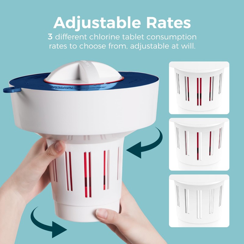 POOL FELLOWS Pool Tablet Dispenser 3 inch Tablets, Floating Tablet Holder with Reminder and 3 Ajustable Settings, Durable Floater for Pools, Large Size, Blue