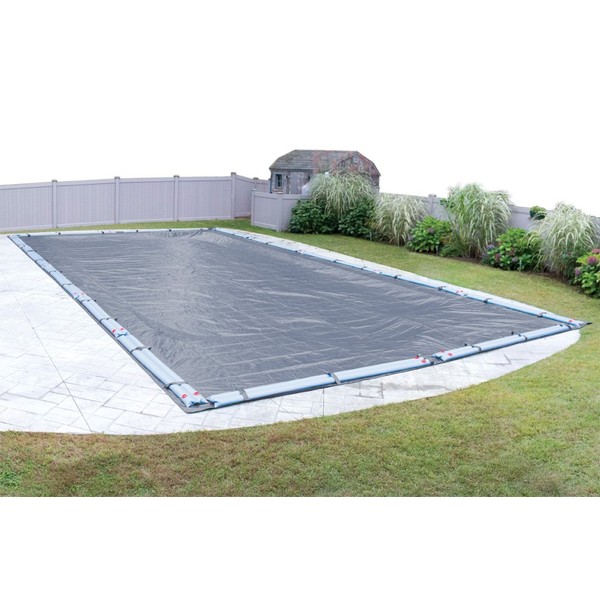 The Pool Mate Classic Azure Blue Winter Pool Cover will protect your pool from winter elements. This is a solid winter pool cover that will not allow water to pass through its material. The azure blue topside of this pool cover is coated to prevent UV damage. Please order by your pool size, as the overlap goes beyond the pool size listed. This cover includes a five-foot overlap. Please order a larger size cover if you have steps (or any other irregularity) protruding from your pool. Water tube loops are placed around the perimeter of the pool cover. Water tubes sold separately. Only water tubes should be used to install this pool cover. No other method of installation is recommended. This cover should be able to comfortably float on the pool water without excessive stress. This cover is not meant to be used as a debris cover during the swimming season. This winter pool cover is intended to be used during the off-season. Includes an eight year warranty.