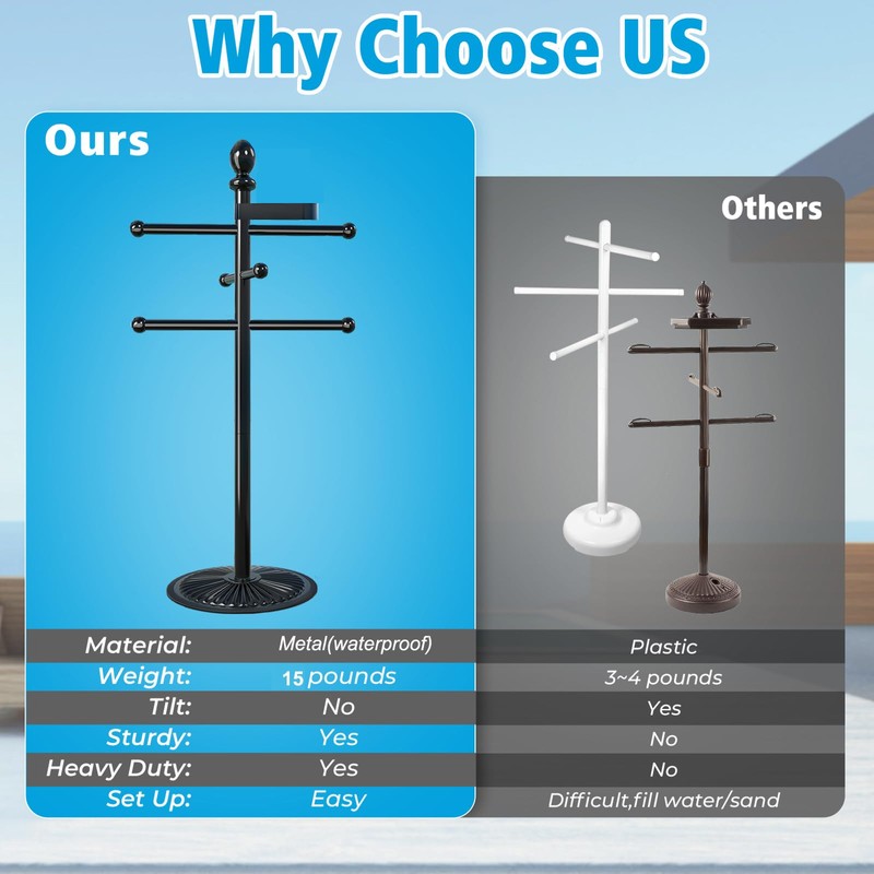 - 【Large Metal Base & Never Tilt】Large metal base, made of high-quality metal, weighs up to 15 pounds, heavy duty and sturdy. Not tilt like those plastic one, even if a 100 pounds object/towel placed on it. Can withstand strong winds, heavy rain etc. Sturdy, you do not need to fill in water or sand troublesomely to make the towel hanger stable like those plastic one.