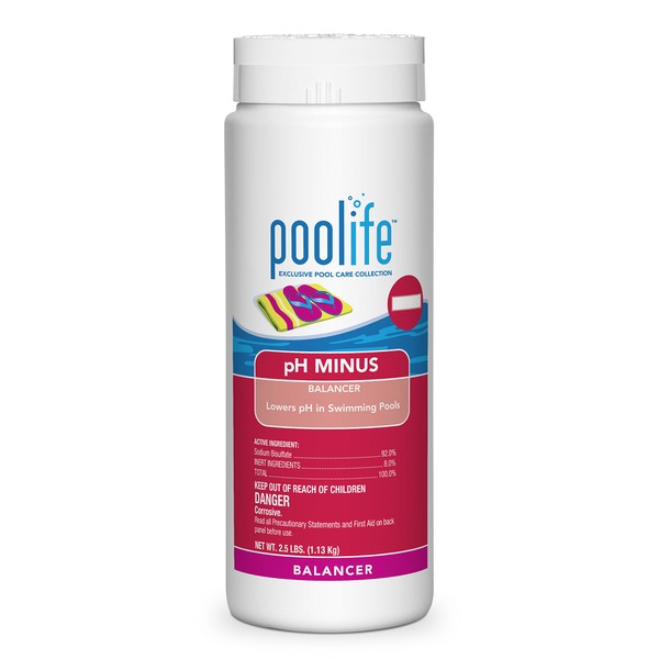poolife pH Minus balancer lowers the pH of swimming pool water. The ideal pH range is 7.2-7.6. Maintaining a pH level above 7.6 keeps your sanitizer from working effectively and can cause scale, eye irritation and skin discomfort. This product also lowers the total alkalinity of swimming pool water.