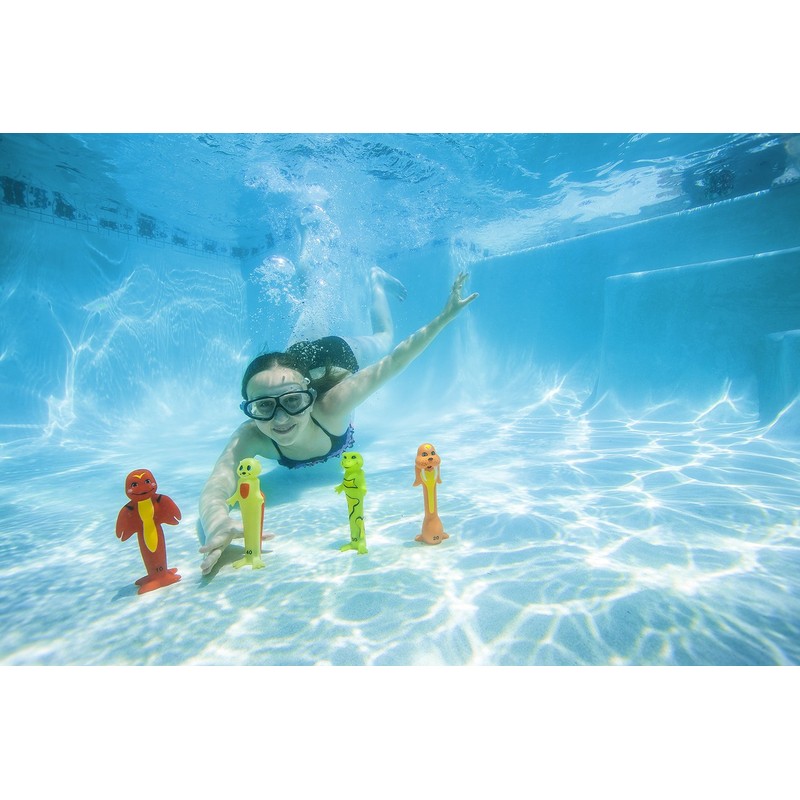 The Soft Funny Dive Animals by Poolmaster includes a set of 4 colorful animal- designed sticks. Each stick is numbered for scoring fun. Lightly weighted and made of durable latex material. Create your own rules for play. Simply toss and wait for them to submerge...then go! Or for a more advanced level of play, toss the animal sticks in the pool and see if you can catch them before they reach the pool bottom. Use your imagination for a fun water play.
