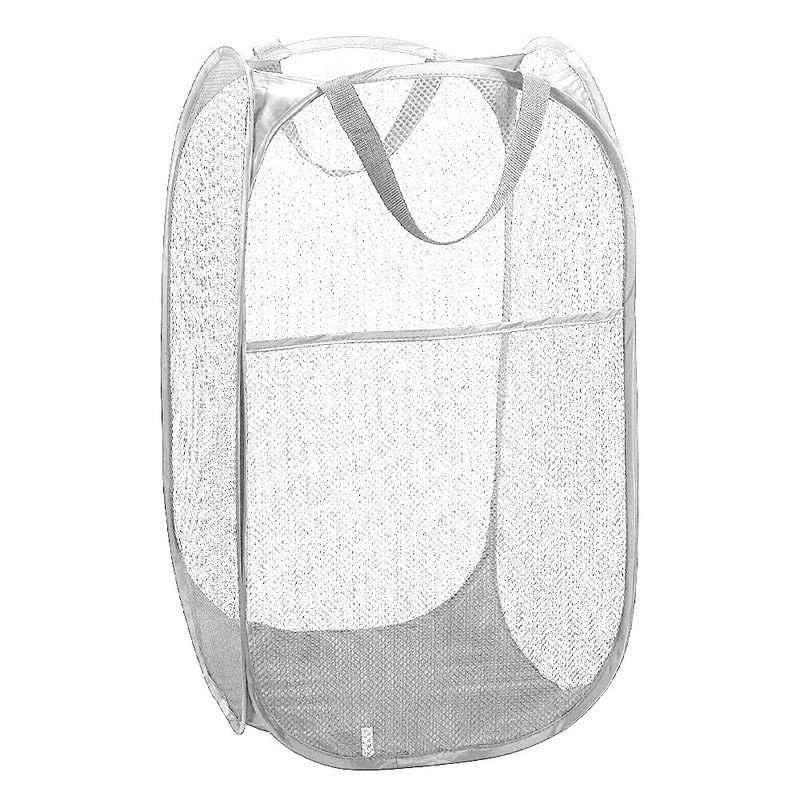 This pop up laundry hamper is a practical storage solution for bedrooms, bathrooms, or utility rooms. Crafted from durable nylon mesh and supported by steel wire, the hamper offers breathability and strength. Its lightweight, foldable design allows it to pop up instantly for use and fold flat for easy storage. Measuring approximately H58 x W35 x D32cm, it provides ample space for laundry while remaining compact. Two sturdy handles make carrying laundry simple, and additional storage pockets offer convenient space for small items. Perfect as a collapsible laundry hamper for efficient, space-saving laundry management.