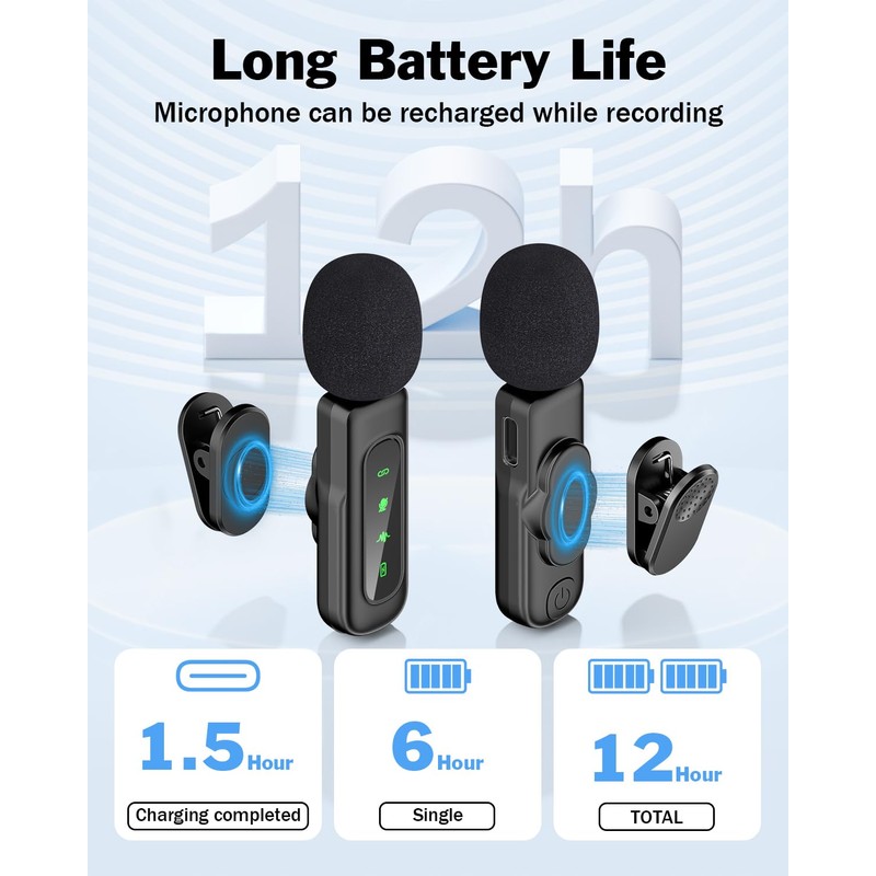 - 12H Working TimeThe lapel microphone can be fully charged in 1.5-2 hours, and can be used for up to 12 hours (each transmitter can be used for 6 hours). Although the microphone only weighs 0.8 pounds, the transmitter is equipped with a built-in 60mah battery that can be used for 6-12 hours after charging fully. Long battery life can support your long-term creative enthusiasm and create more satisfying works.