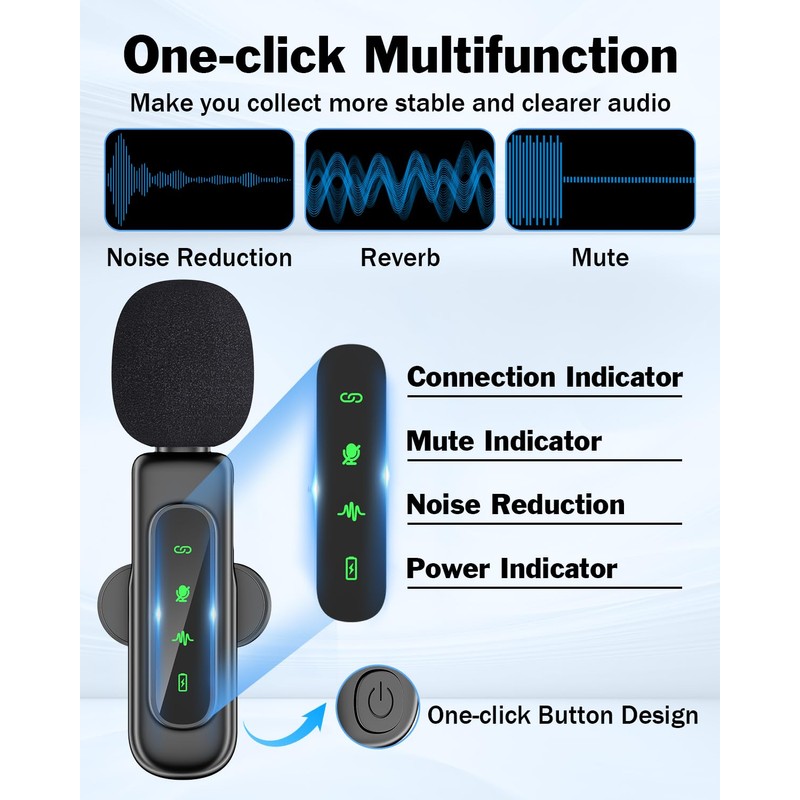 - Automatic ConnectionThe lavalier microphone is plug and play, no needing any Bluetooth or installing plug-ins and applications, just plug in the phones and other devices and it's ready to use. In addition, there is a display screen on the mini microphone that displays each function. You can intuitively confirm whether the device is connected and the function is turned on by the function indicators.