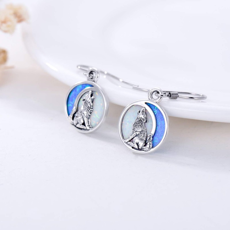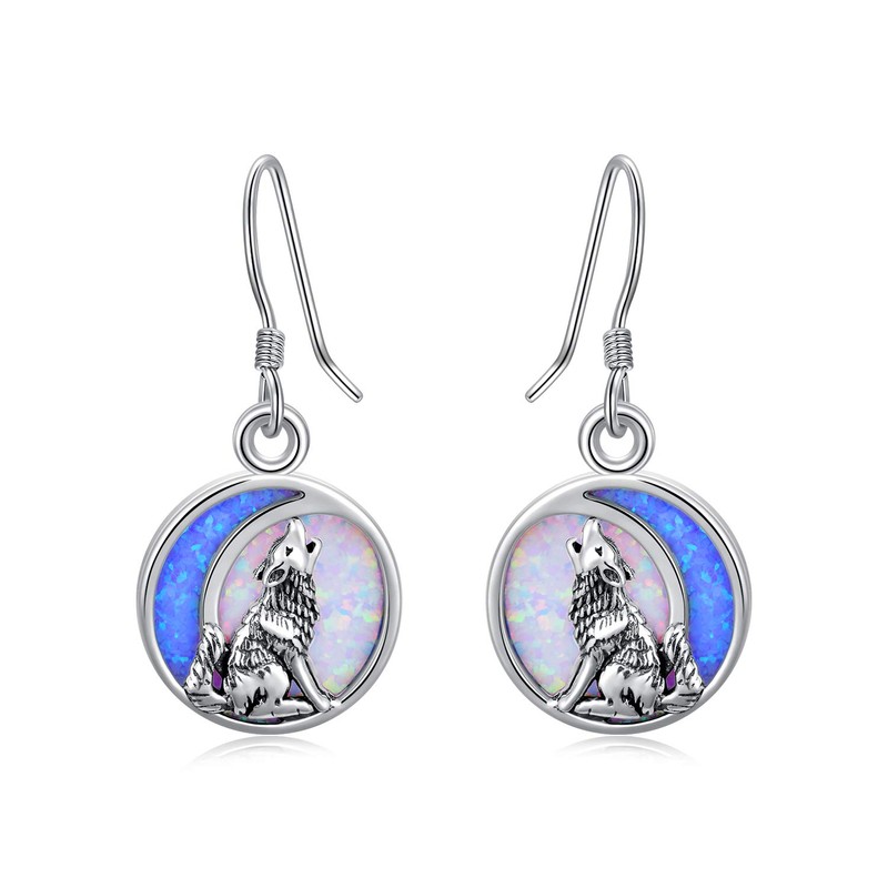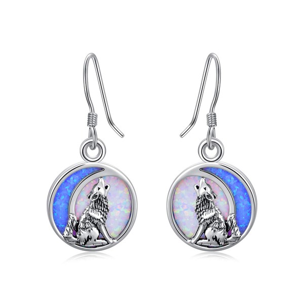 POPKIMI Wolf Earrings for Women Wolf Opal Moon S925 Sterling Silver Dangle Drop Hook Earrings (Wolf Opal Moon)
