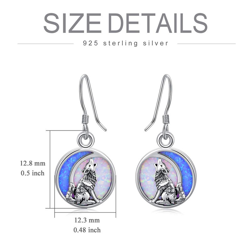 • WOLF ON MOON EARRINGS: Unique howling wolf on crescent moon. Wolf symbolizes power, personality, strong. The opals are nice size and catch the light at all angles flashing shades of off white, green, blue and pink as the light moves across them, you will get plenty of the desired opal shimmer, even in the three meters. The opals Symbolize luck, hope, purity and happiness.