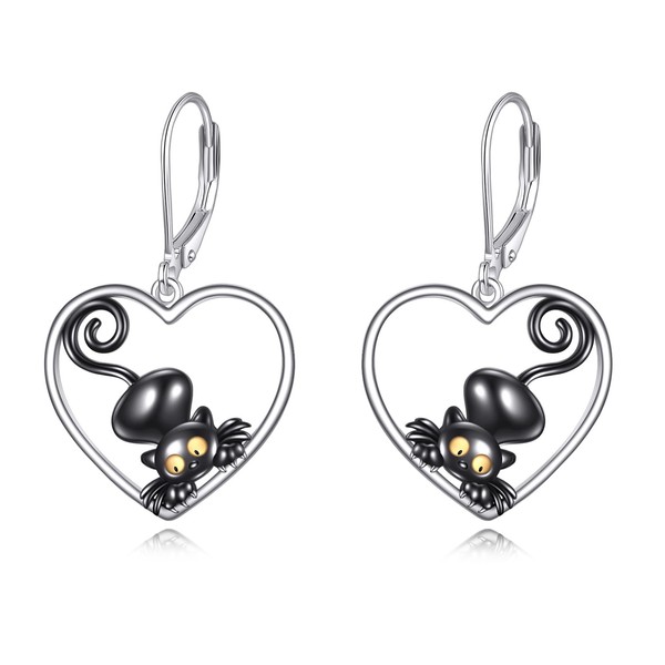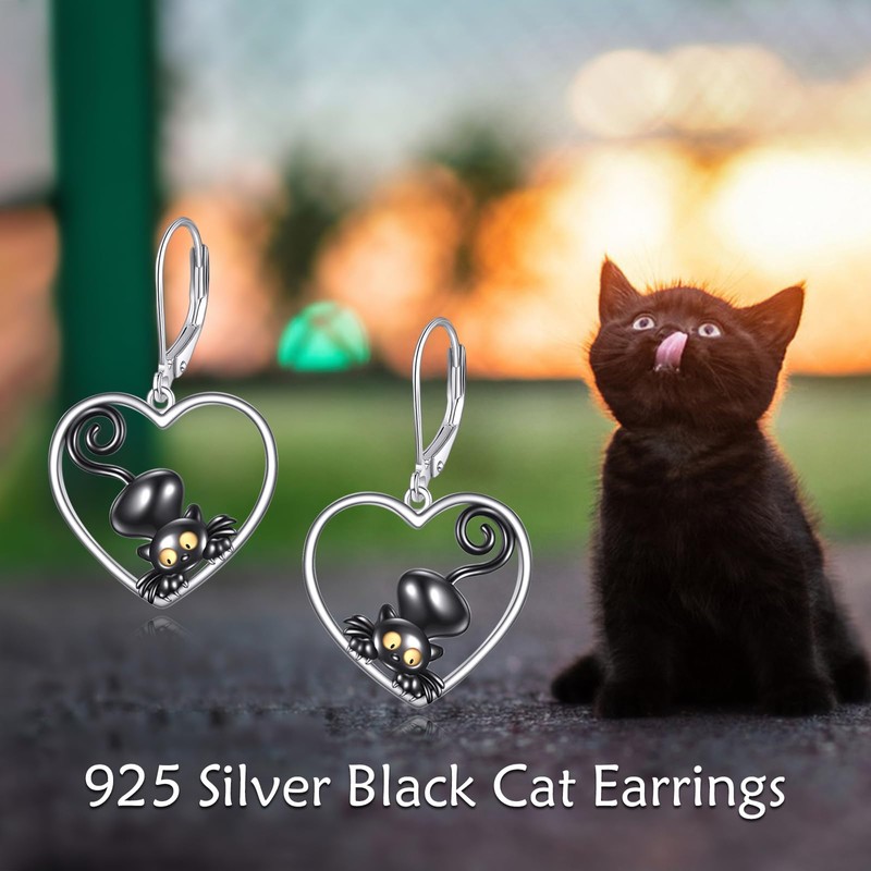 POPLYKE Black Cat Drop Dangle Earrings 925 Sterling Silver Lever Back Cat Jewelry for Girls Women Christmas Gifts (Heart)