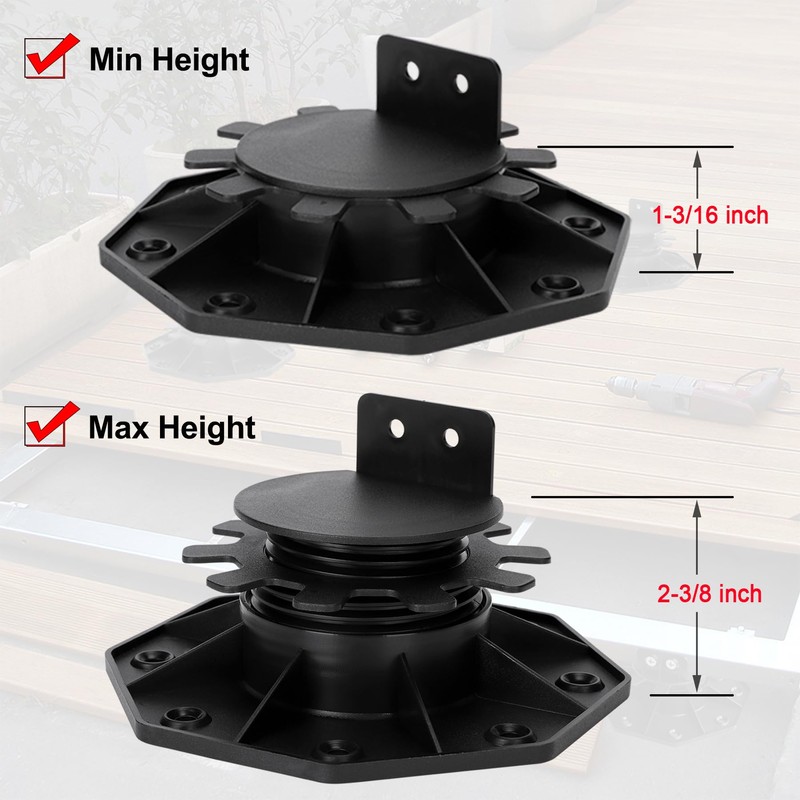 - Adjustable Height: POPMERE deck support pedestal has 2 height adjustment screw posts, allowing you to easily adjust the height from 1-3/16" to 2-3/8". It can facilitate easy bridging where the height difference needs to be compensated.