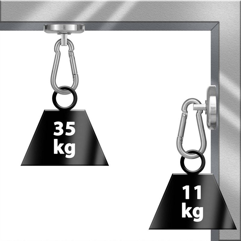 - Includes: Set of 2 strong magnetic carabiners (clamping force 90 degrees to the surface 35 kg, 360° rotation possible, weight 59 g, colour silver)