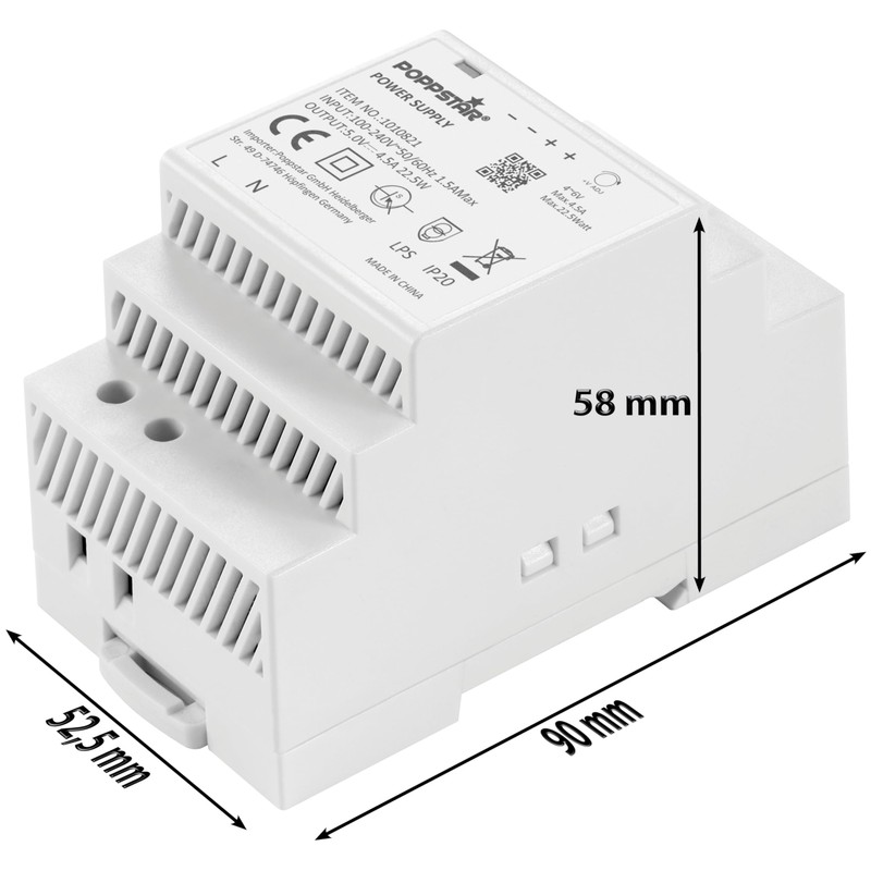 - Delivery: Din-Rail top-hat rail power supply unit with DC OK indicator light (52.5 x 90 x 58 mm, output: 5V 4.5 A; power: 22.5 watts)
