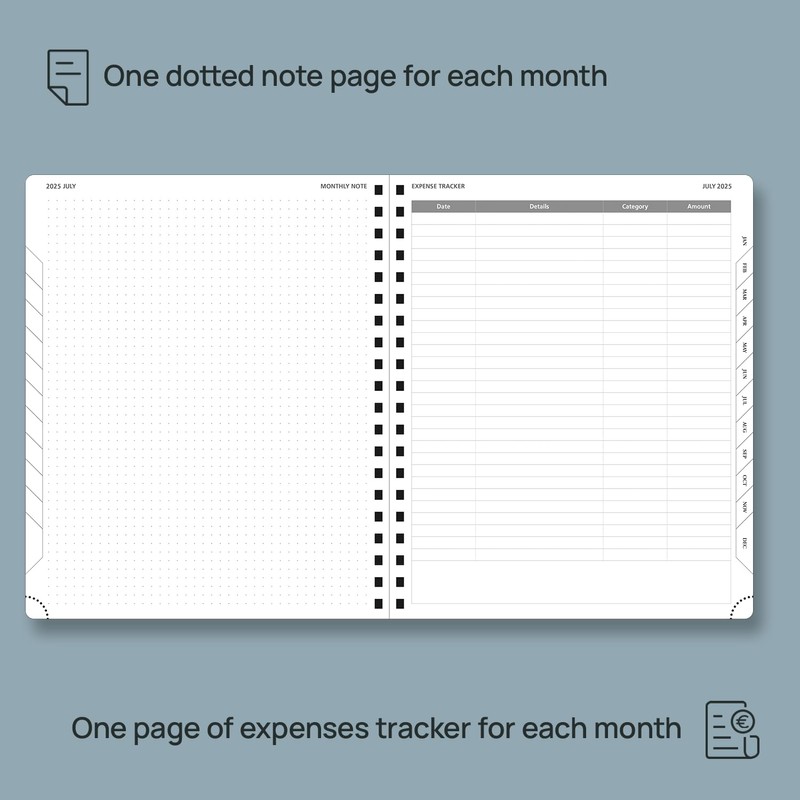 - EXTRA PAGES: This 2025-2026 monthly planner also contains "2025-2026 Yearly Overview" Page + "2025-2026 Holiday & Calendar" Page + Monthly Expenses Page+ Contact & Password Pages + 7 Dotted Notes Pages for jotting down your ideas, thoughts or any other happy things in detail.
