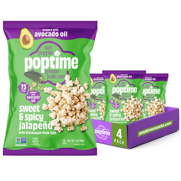 Poptime Popcorn Snack Bags – Sweet & Spicy Jalapeno & Himalayan Pink Salt Kettle Corn Popcorn Bags, Healthy Snack With Avocado Oil, Gluten Free, Vegan, Low Calorie, Non-GMO, Kosher - 7 oz - Pack 4