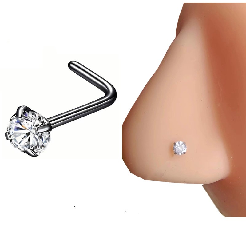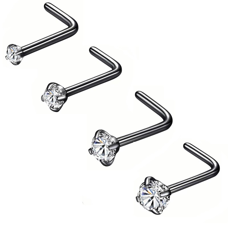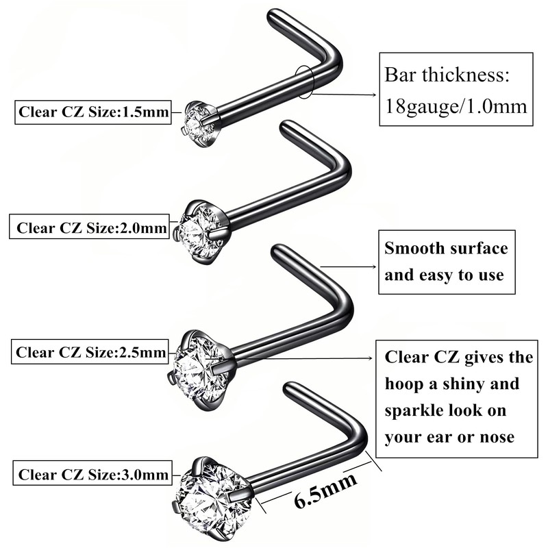 - Includes 4 nose studs in different sizes (1.5mm, 2mm, 2.5mm and 3mm, 1 piece for each size). 4pcs L shaped nose rings studs for women measurement:6.5mm wearable length and prong set cubic zirconia measures 1.5mm/2mm/2.5mm/3mm in diameter. Bar thickness is 1.0mm (18 gauge)