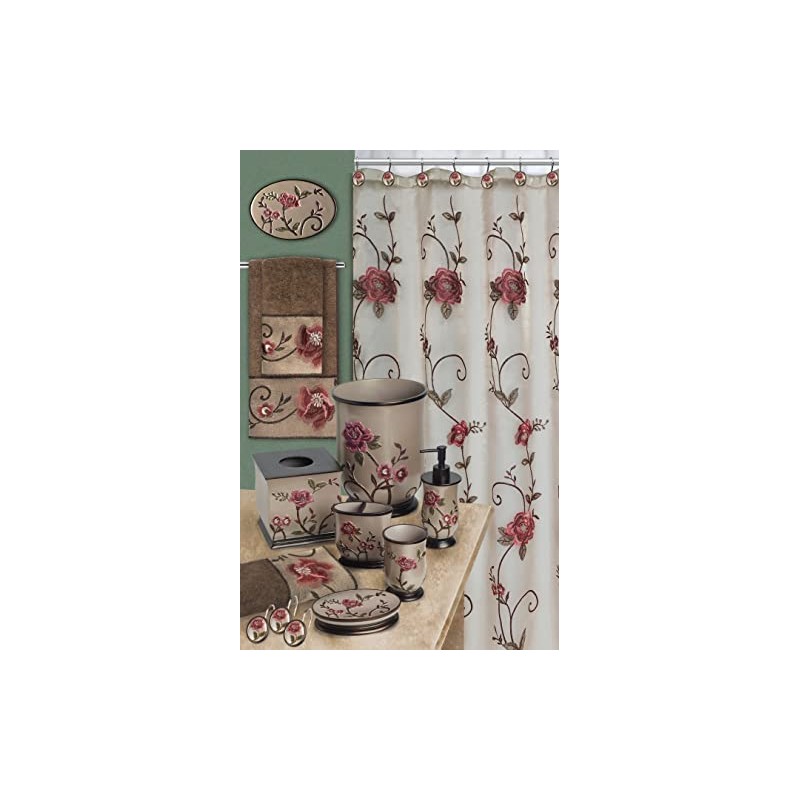Larisa is a full 72x72 inch shower curtain and coordinated with hooks and accessories sold separately. The coordinate comes in a Rose story. The coordinate includes a shower curtain, shower hooks, wastebasket, tissue, Tumbler, soap dish, toothbrush, lotion pump, 3 pc towel set, bath rug and contour tug