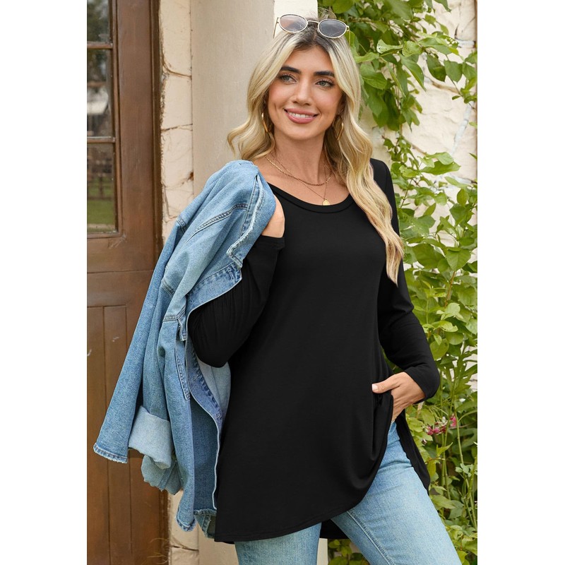 POPYOUNG Women's Long Sleeve Tunic Tops Fall Long Shirts to Wear with Leggings Loose Fit Dressy Crewneck Blouse L, Black