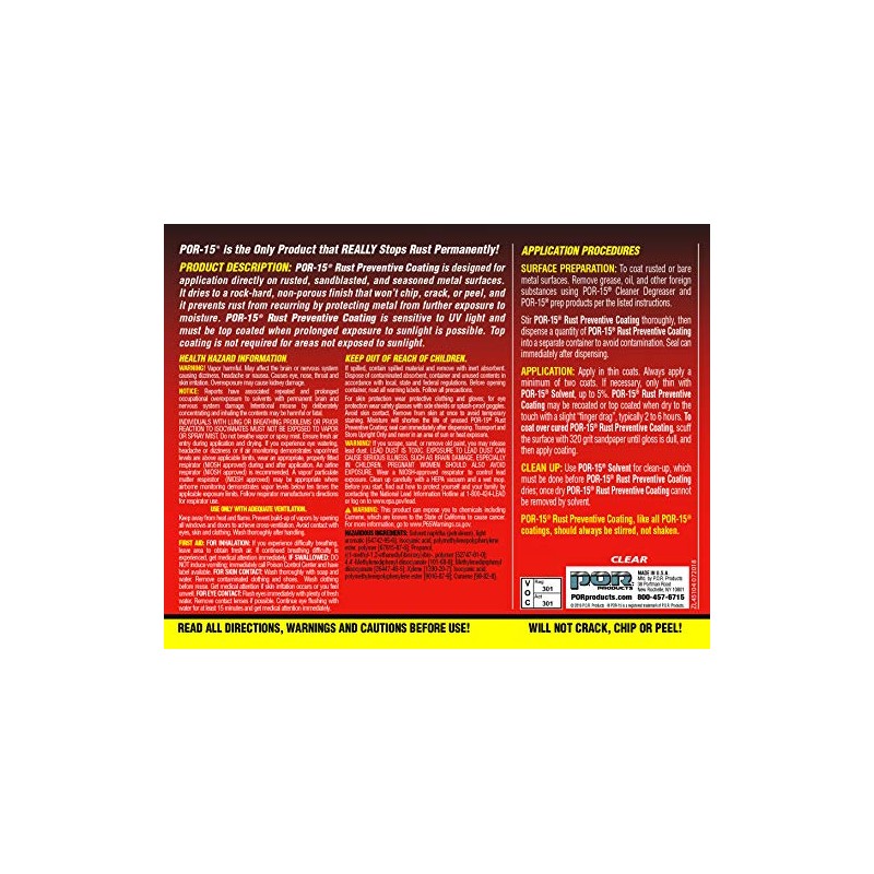 • ✅ OUR SATISFACTION COMMITMENT – At POR-15 we strive to bring the ultimate in rust prevention. Known for the unbeatable 3-step stop rust system, POR-15 is trusted by DIY & Professionals. We are committed to innovation, quality control, and excellent customer service.