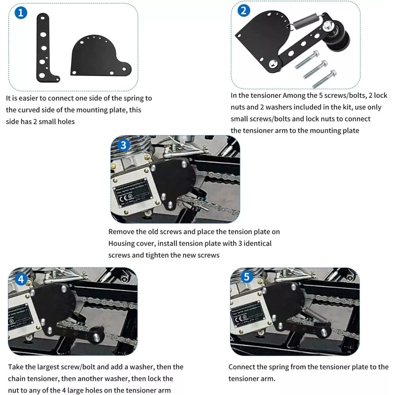 Step 3: Remove the old screws from the housing cover, place the tension plate on the housing cover, then use 3 identical screws to install the tension plate on the top of the housing cover and tighten the new screws. Step 4: Take the largest screw/bolt and add a washer, then the chain tensioner, then another washer, and then lock the nut to any of the 4 large holes on the tensioner arm (make sure two Washer on the side) Step 5: Connect the spring from the tensioner plate to the tensioner arm.