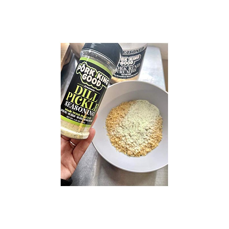 No dilly-dallying over here! If you’re as pickle obsessed as we are, you’ll love the tartness of our Dill Pickle seasoning - popping with the perfect pickle-y flavor! Side note: Want to try some magic? Sprinkle our Dill Pickle seasoning on cucumber slices to instantly transform them into pickles! Try the same with any raw veggie that you'd eat "pickled". It's fun and weird and a great way to play tricks on your kids and/or spouse! Some sprinkling ideas: - Grilled or Fried Chicken (think Chick-fil-A style!) - Nuggets - Wings - Nuts - Popcorn - Burgers - Raw veggies - Chip dip (mix with sour cream!) - Pork Rinds - Fried Fish - Pickling! (see Side Note above) Ingredients: Salt, Sodium Diacetate, Spice Extractives, Dill Weed Pork King Good Seasoning Information: - Clean & Natural Ingredients - 0 g Carbs Per Serving - Gluten Free - Keto Friendly - Paleo Friendly - Contains No MSG