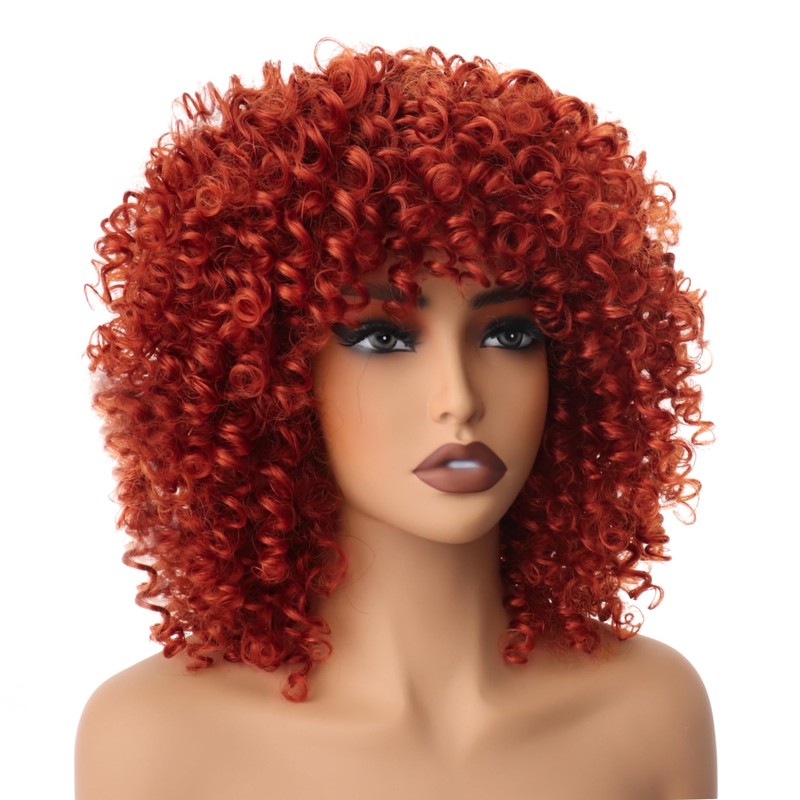 PORSMEER 14 inch Afro Curly Wigs for Women, Short Loose Kinky Curly Wigs with Bangs for Black Women, Synthetic Afro Curls Hair 70s (Auburn)