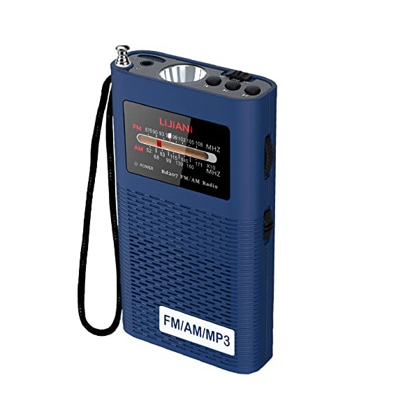 Portable Backlit AM/FM Radio MP3 Player Pocket Transistor with Flashlight 2200mah Battery Operated, Long Antenna Best Reception, Powered Replaceable,Bass,TF Card Player,Easy Tuning at Night(Blue)