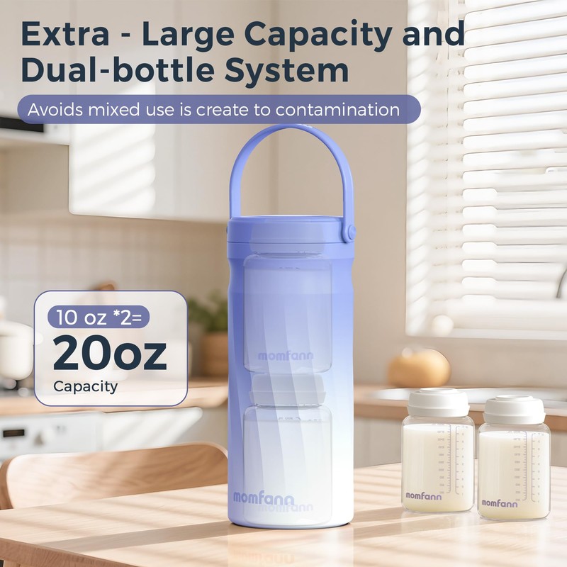 - 20oz Large Capacity and Dual-bottle System: breast milk cooler with two separate bottles,perfect for all-day feeding. this innovative design handles multiple pumping sessions effortlessly. Keep warm and cold milk separate in the two dedicated bottles to maintain freshness and protect your baby's health all day long.