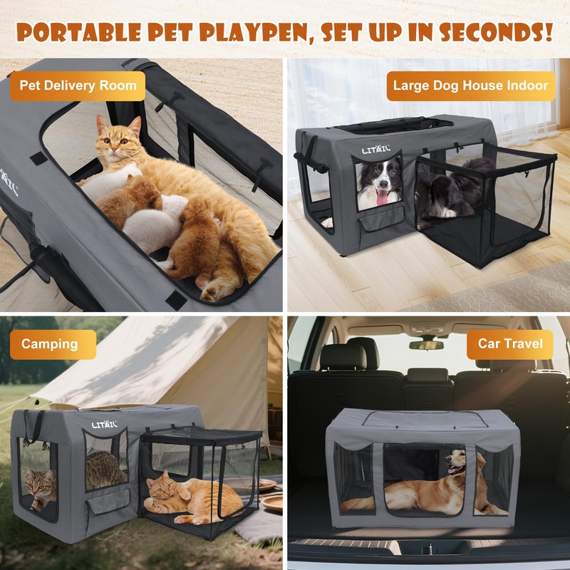 - ✨Versatile 2-Zone Pet Playpen: This innovative pet play pen features dual functional spaces—a play & dining area or a private litter zone—to keep your pet’s living space clean, organized, and stress-free. The spacious design accommodates litter boxes up to 19”. Perfect for cats and small to medium large dogs, this playpen creates a cozy, hygienic retreat for feeding, napping, playtime, and litter needs—all in one secure setup