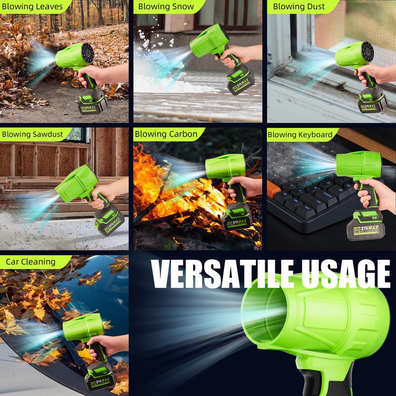 - 【Adjustable Airflow Control】AKELOR portable cordless leaf blower customize your cleaning with intuitive wind speed adjustment. Simply press the trigger to increase or decrease airflow instantly. Whether you're detailing your car or cleaning your patio, you’ll always have the right power at your fingertips.