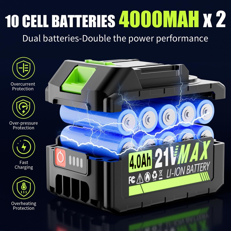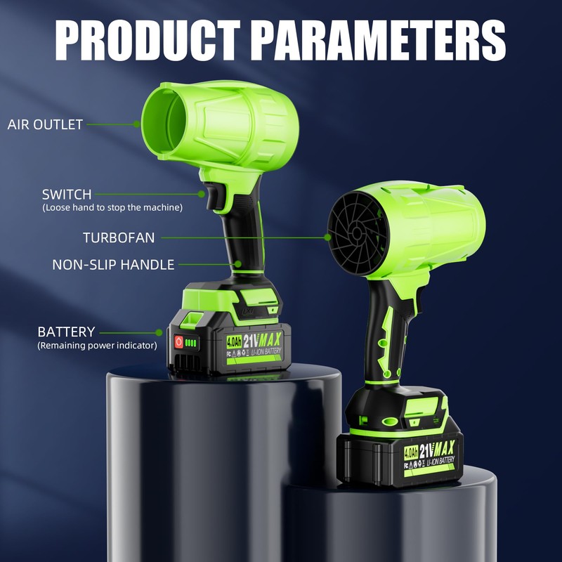 - 【Complete Cleaning Kit Included】Package includes: 1×AKELOR cordless blower (Green), 2×21V 4000mAh batteries, 1×charger, 1×tool holder, and 1×pair of noise-reducing earplugs. Double battery setup ensures uninterrupted operation for large cleaning projects.