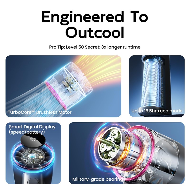 - [Smart Digital Command Center]: Real-time battery and speed level glow on OLED display, visible even in direct sunlight. Compared to basic LED fans, our visualized system prevents sudden shutdowns during important meetings or travel emergencies.