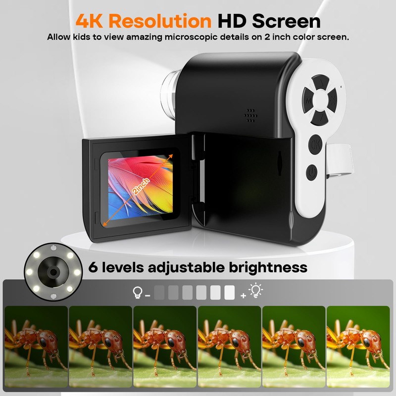 • 【4K HD Resolution, 6 Ajustable LED Lights】A higher quality kids microscope: 2-inch screen,3840*2160P photo resolution and 1920*1080P video resolution. This potable microscope with screen provides clear and detailed observation, home education, science education or outdoor exploration. It has 6 levels of adjustable brightness, the light is soft and gentle to the eyes. This handheld microscope adapts to different lighting conditions, making scientific exploration more fun.