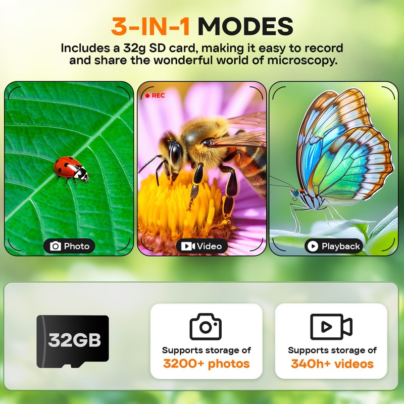 • 【3-in-1 Kids Microscope,Comes with 32g SD card】 This microscope for kids is fully functional and easy to use, with a detailed instruction manual to help you quickly master the usage. This kids portable microscope combines the functions of photo, video and playback, perfect for little explorers. Comes with a 32g SD card to allow your kids to store their explorations, approximately 3200 photos and 340 hours of video. Observation with 5 color filters will have a different experience.